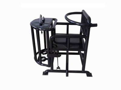 靠背、座面、椅腿、扶手及xiong部约束环另外包括座椅前设有整体弧形开关装置。其桌面上方装有U型锁具,方便约束其手腕。椅腿下方装有直接与地面固定底盘。
