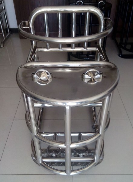 包括靠背、座面、椅腿、扶手及胸部约束环另外包括座椅前设有整体弧形材质: 管壁厚度为贴标2.0mm工业管制成;座面不锈钢板厚度为贴标1.5mm制成;桌面不锈钢板厚度为贴标1.5mm制成;扶手不锈钢管厚度为贴标2.5mm;工业不锈钢管制成;伸缩腿为不锈钢管壁厚度为贴标1.5mm;脚部约束环采用5.0mm工业不锈钢板制成。