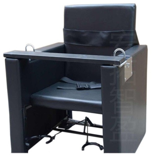 4、特性:审讯椅手部采用U型锁约束,U型锁下按至合适位置将嫌疑人手部锁住,扶手部位宽度便于签字书写;xiong部及腰部以约束带束缚;腿部以环形脚踏锁,jing员在椅后用脚踏可将锁打开,嫌疑人小腿置入,踩踏锁上,操作方便。