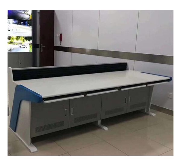 该操作台设计简洁实用,适合用于指挥中心、控制室等场所。配备多个抽屉和柜门,方便存放工具和文件,底部设有通风口,有助于设备散热。