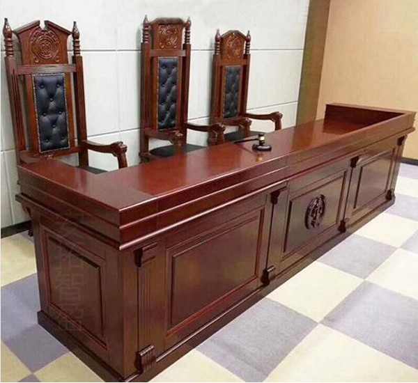 简要描述: 这款审判台 法官台选用E1级环保中密度板,甲醛达标,采用胡桃木木皮,橡木实木封边,防腐防虫,含水率10%-12%。环保亚光聚酯漆,耐磨防刮,色泽柔和不反光,优质配件拼接牢固,间隙均匀,稳固耐用。实木雕刻法徽,