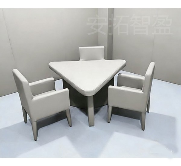 这款软包三方谈话桌,家具板制作,全软包和高密度海绵,全方位消除棱角,避免磕碰受伤,加厚板材和防腐处理,还有三角结构,抗弯抗变形,长期平稳承重。三角造型和标准高度,完美适配三方谈话场景。西皮软包,环保材料,触感柔软透气,易清洁,耐磨抗老化。是司*法、gong安留置室,jian察院询问室、心理咨询等场所的理想选择。